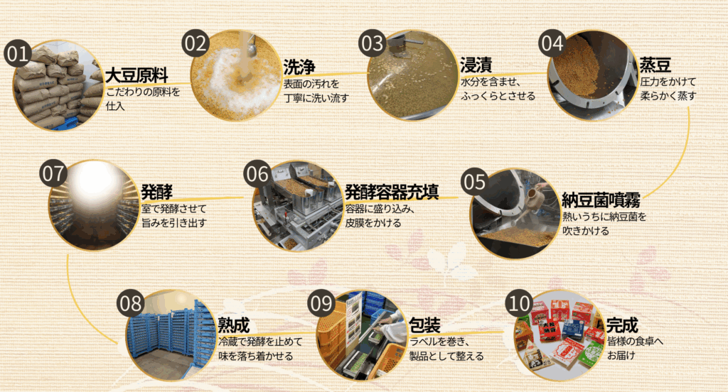 使用商品:花巻納豆 粒、県産中粒納豆、ひえカレー納豆3P、梅納豆、盛岡納豆、業務用カップ納豆